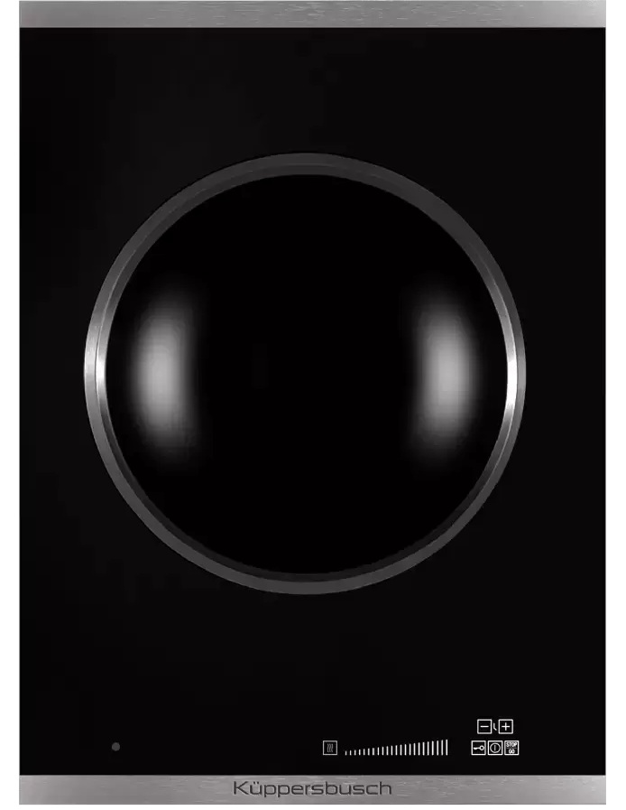 Индукционная варочная панель Kuppersbusch VKIW 3800-0 SR — это премиальное решение для ценителей современной кухонной техники. Модель выполнена в изящном черном цвете с безрамочной обработкой края и профилем из нержавеющей стали, что придает ей элегантный и стильный вид. Главная особенность панели — специализированная индукционная конфорка Wok мощностью до 3 кВт, обеспечивающая быстрый нагрев и равномерное распределение тепла для приготовления блюд азиатской кухни. Электронное управление с сенсорными переключателями TouchControl, сенсорным слайдером TouchSlider и цифровым дисплеем позволяет точно настраивать режимы работы. Модель оснащена широким набором функций: автоматическое распознавание посуды, автоматика закипания, режим Power, таймер с отключением и 13-ступенчатая регулировка мощности. Безопасность обеспечивают блокировка управления, защита от детей, индикатор остаточного тепла и централизованное отключение.