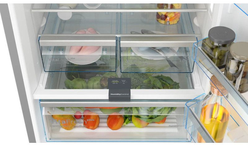 Отдельного внимания заслуживает зона свежести VitaFresh plus, поддерживающая оптимальные условия для овощей, фруктов и других скоропортящихся продуктов. Светодиодная подсветка обеспечивает хорошую видимость содержимого на всех уровнях.