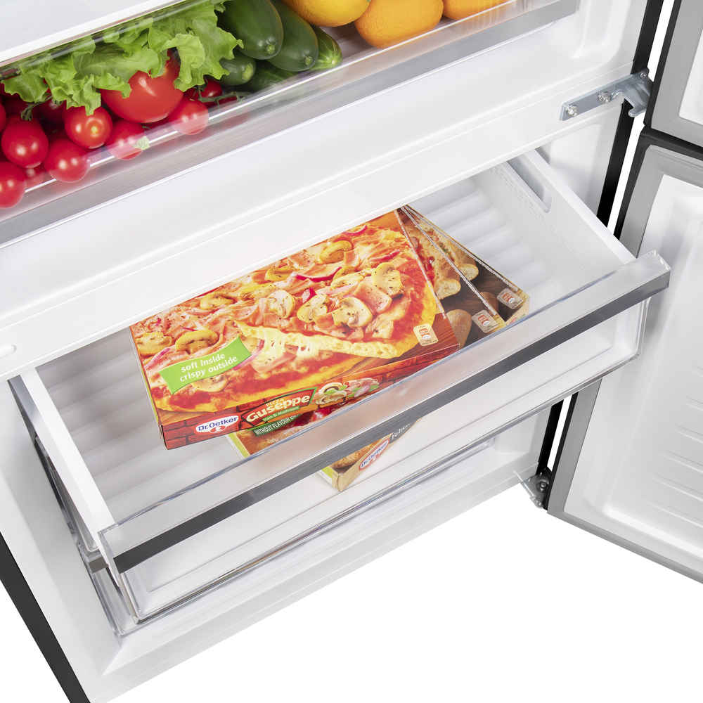 Практичная внутренняя организация включает полки из стекла с металлической окантовкой, боковые полки на дверце, решётку для бутылок и лотки для яиц. Корпус из металла в цвете «чёрная нержавеющая сталь» и возможность установки вплотную к стене упрощают размещение в современном интерьере.