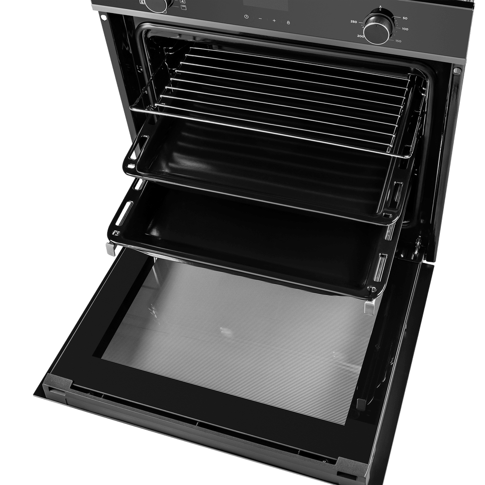 В отделке блока управления используется жаропрочное стекло, которое не выцветает и не боится высоких температур, сохраняя презентабельный вид на долгие годы. Внутреннее покрытие выполнено эмалью легкой очистки: осевший жир легче удаляется, поэтому уход за духовкой не отнимает много времени. Телескопические направляющие и хромированные элементы добавляют удобства при ежедневной эксплуатации.