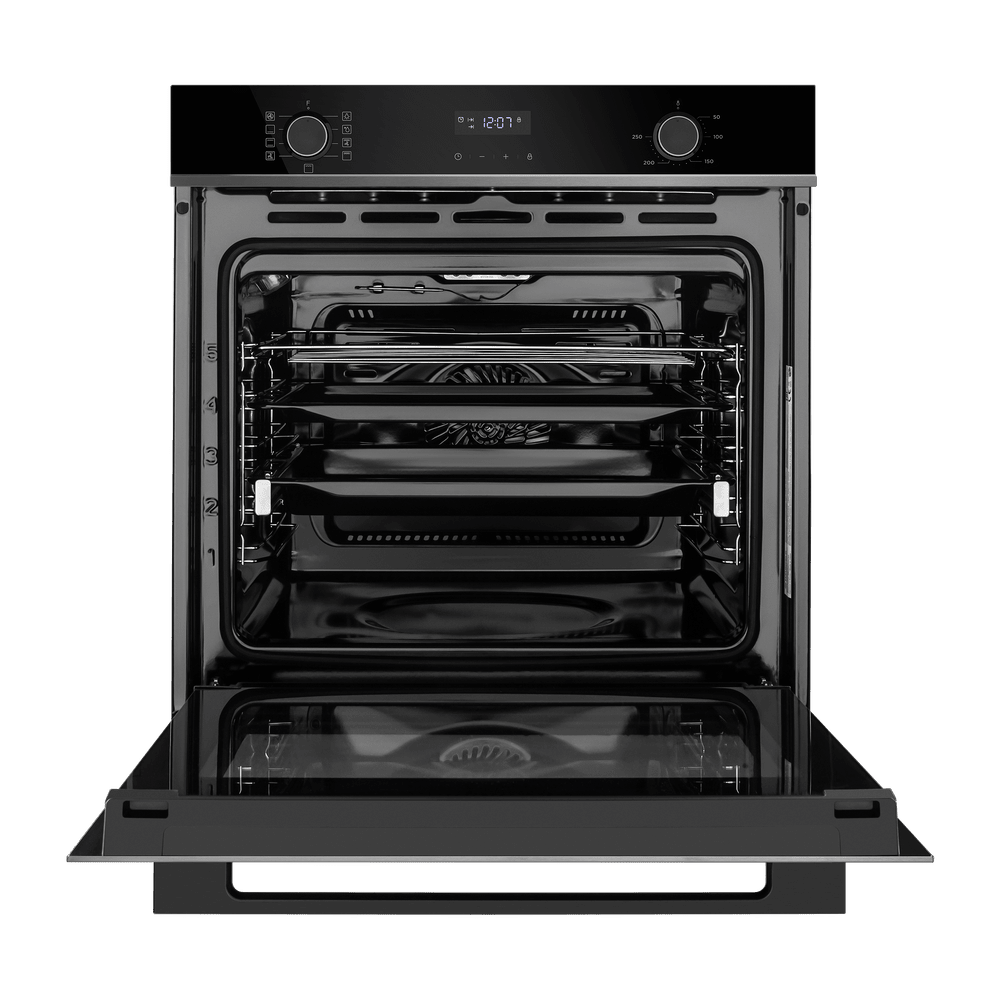 Особого комфорта добавляют утапливаемые ручки PUSH PULL, которые скрываются в панели после настройки режимов — лицевая часть выглядит аккуратно, а ухаживать за ней проще. Тройное стекло дверцы формирует «холодный фронт»: внешняя поверхность нагревается медленно, что делает процесс приготовления безопасным даже при наличии детей.