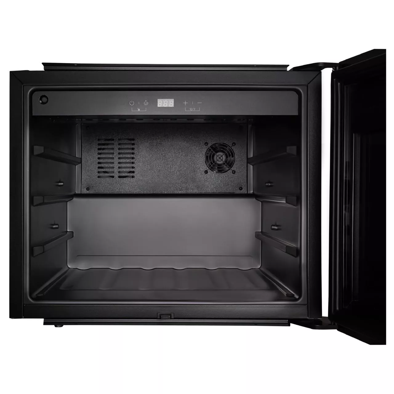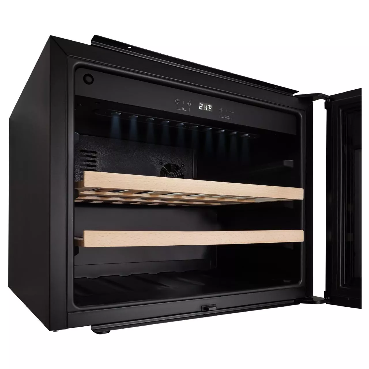 Внутреннее LED-освещение подчеркивает внешний вид бутылок и делает процесс выбора вина удобным и простым. Кроме того, шкаф оснащен функцией сенсорного управления, которое позволяет легко и быстро настроить нужную температуру. Диапазон температур от +5 до +20 градусов Цельсия обеспечивает идеальные условия для хранения различных видов вина. Вместимость шкафа составляет 28 бутылок, что позволяет хранить великолепную коллекцию вин. Две деревянных полок обеспечивают удобное размещение бутылок.